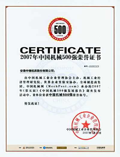 中德公司入選2007年(第五屆)“中國(guó)機(jī)械500強(qiáng)”